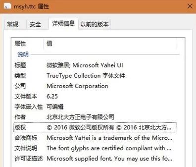 通过图片可知,“微软雅黑”字体版权归微软公司和北京北大方正电子有限公司共有。如果是只在电脑上显示,或者临时打印,不用于商业用途,是可以免费使用的。如果用于商业用途,或者用于Windows系统以外的电脑系统中显示文字,就涉及侵权行为。