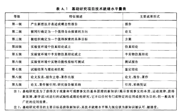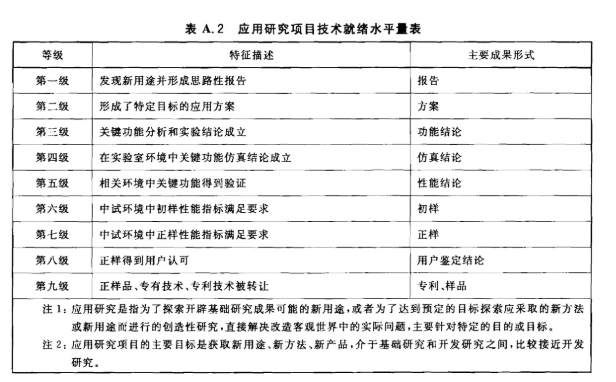 中国也引进了该指数并被改良编制成为国家标准GB/T22900-2009《科学技术研究项目评价通则》,用于对科研和技术开发项目进行管理和评价。GB/T22900-2009根据项目的研究层次分为基础研究项目、应用研究项目、开发研究项目,并分别建立了对应的技术就绪水平量表(见下三表)。