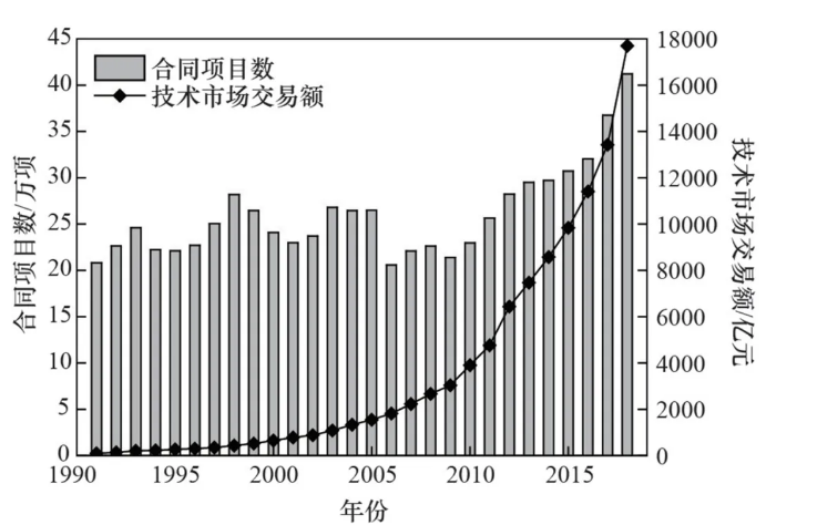 国内技术市场发展历史较短,但与国际技术市场相比属于加速发展且轨迹相同。