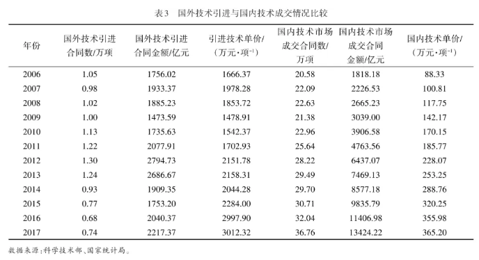 但自2000年以来,随着中国科技水平的提高,技术市场的国际技术依赖有所减缓,国内技术市场缓慢呈现“自给自足”的良好趋势,但技术的低附加值又成为制约中国技术市场发展的另一因素。