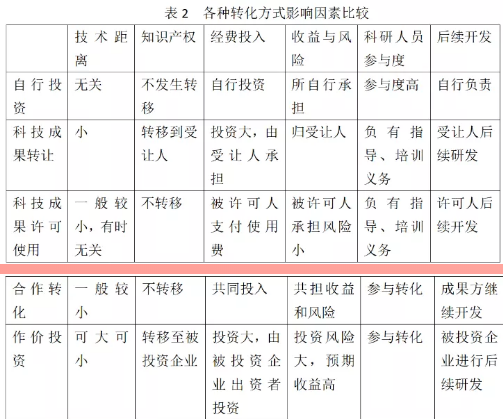 影响科技成果转化方式选择的因素很多,包括研发人员奖励与报酬机制、知识产权、专利的有效性、知识特性、科技成果所有人与转化人(或转化方)之间的技术距离等。国内外研究发现,技术转移不易发生在技术距离过大的主体之间,较小的技术距离有利于技术转移成功。