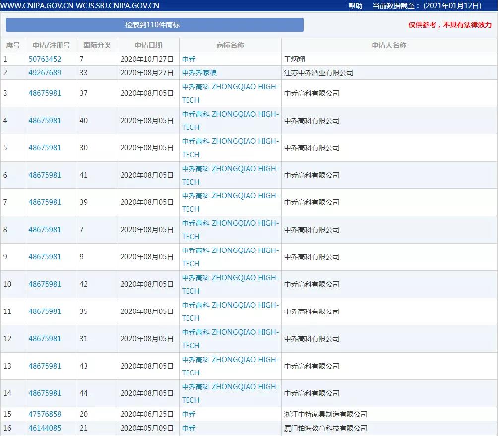 据中国商标网显示,截至2021年1月12日,共有110件"中乔"相关的商标申请,而这110件"中乔"相关商标没有1件由中乔体育申请.